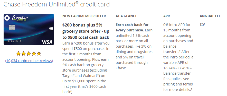 First, apply for the Chase Freedom Unlimited Card which is offering a $200 bonus when you spend $500 (on anything) in the first 3 months and 5% cash back on groceries for the first 12 months. There is NO annual fee!